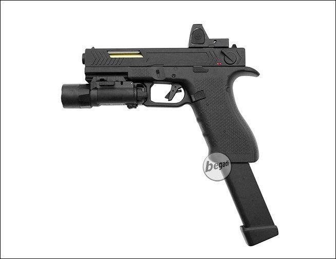 Die S&T ST316 K ist der große Bruder der C. Sie hat ein eingebaute Zielfernrohr im Griff und durch die erhöhte Lauflänge und die Maxx HopUp Unit erzielt die ST316 K eine gute Reichweite bei schnellem Ansprechverhalten